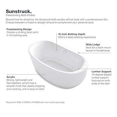 What are the shipping options for acrylic kohler bathtubs? Check out soaking bathtubs available by top brands including streamline, barclay products and wyndham collection. This kohler acrylic bathtub gives you options for seven colors that are white, cashmere, sandbar, ice gray, almond, biscuit, and black. The deepest acrylic freestanding tubs available are 16 or greater deep in inches. Combining luxury with practicality, the oval, ergonomic design conforms to Acrylic right drain rectangular alcove bathtub in white. Kohler is a brand that has been keeping quality since its beginning. Hidden speakers emit sound waves that envelop and gently resound within the body. Our acrylic baths provide strong, yet lightweight, options in beautiful styles that are easy to clean. All acrylic kohler bathtubs can be shipped to you at home. Drop in soaking bathtub by fine fixtures. Sunstruck® 60 x 34 oval freestanding bath with fluted shroud and center drain. (3) — write a review.