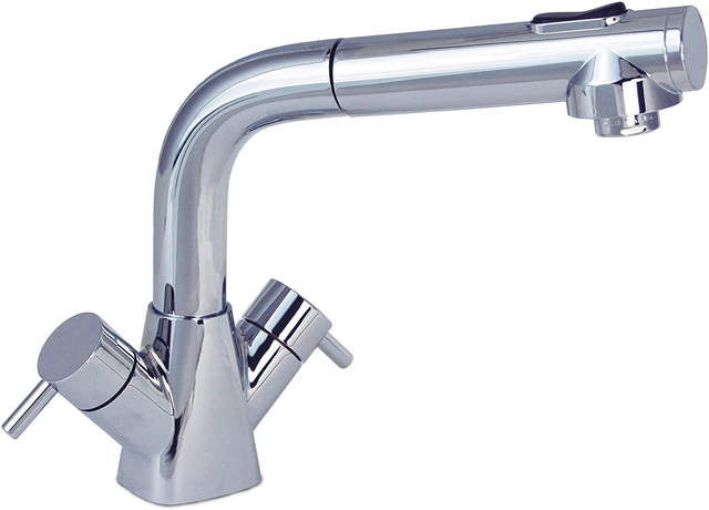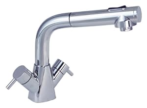 Trinidad head/shower combo faucet with black classic sprayer (with teeth) has a 6' stainless steel hose.